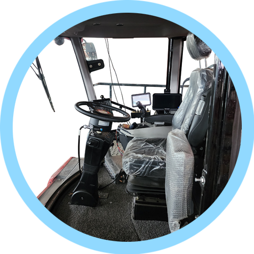 整車全部功能都可以在扶手箱電控按鍵進行操作。 增壓駕駛室寬敞明亮,保護駕駛員安全。配備豪華氣動懸浮座椅,副駕駛位。 智能車載系統可以清晰顯示油溫水溫轉速等基本信息并且搭配進口智能噴霧系統。